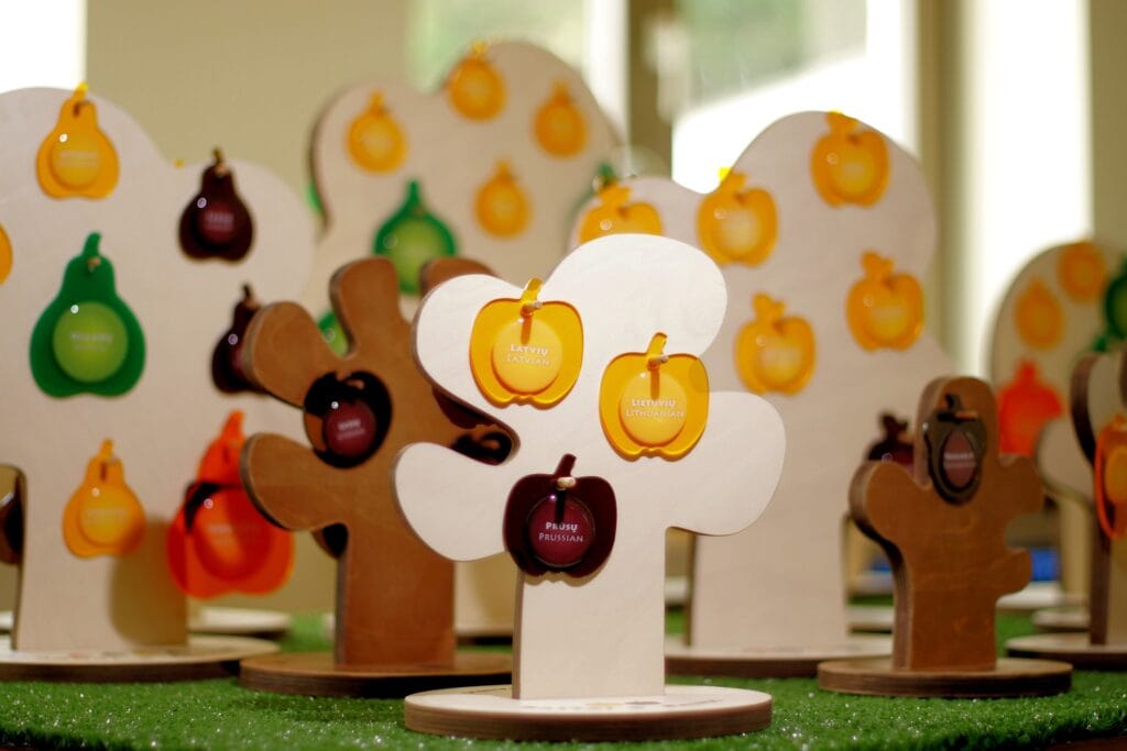 Lietuvių kalbos instituto interaktyvus edukacinis užsiėmimas „Paliesk lietuvių kalbą rankomis“ žaismingai pristato svarbiausius lituanistikos ir kalbotyros pasiekimus, supažindina su lietuvių kalbos istorija, skatina pasididžiavimą lietuvių kalba, atskleidžia jos išskirtinumą ir vietą pasaulio kalbų kontekste bei pristato mūsų kalbą užsieniečiams. Edukacinio užsiėmimo metu pasitelkiami unikalūs, interaktyvūs eksponatai – kalbos žaislai, leidžiantys kiekvienam paliesti kalbą rankomis ir pačiam pajusti jos savitumą, o dalyviai turės galimybę pamatyti, kaip lietuvių kalba atrodo indoeuropiečių kalbų įvairovės kontekste, pažinti lietuviškų žodžių atitikmenis kitose pasaulio kalbose, sužinoti, kokius žodžius lietuviai paskolino kitoms kalboms, susipažinti su pasirinktų žodžių kilme, tautos kultūrine raida ir istorija. Ši kilnojamoji ekspozicija vis plačiau keliauja ir už Lietuvos ribų. Ji jau yra aplankiusi daug įvairių užsienio miestų (Stokholmą, Londoną, Dubliną, Tokiją, Berlyną, Liuksemburgą, Briuselį, Kairą, Abu Dabį ir kt.). Interaktyvūs žaislai ir jų istorijos iki šiol sudomina tiek mokyklinio amžiaus vaikus, tiek suaugusiuosius.